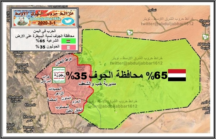 خرائط حروب الشرق الاوسط On Twitter الحرب في اليمن محافظة الجوف خريطة تبين نسبة السيطرة على الارض من قبل الطرفين القوات الحكومية الشرعية والقوات الحوثية لغاية اليوم 30 3 0 2020 Https T Co Yr2xpyviwf
